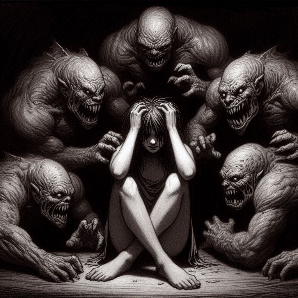 Image Description: A woman sits on the ground with her hands on her head, her head down, and her eyes closed. Surrounding her are monsters reaching out to clutch at her.